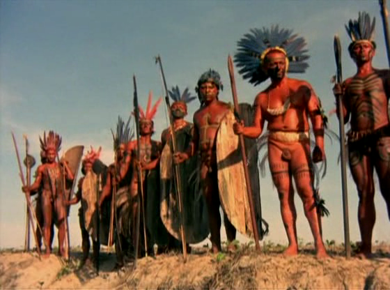 Vamos ahora a lo erótico que es un elemento que sirvió mucho a la hora de difundir el filme. Lo antropofágico también está relacionado con el erotismo (ver epígrafe de Gustavo Cerati). Tener sexo es comerse al otro, dice el lugar común, y esto también nos remite a la metáfora gastronómica16. Recordemos la forma en que Seibopep despierta a su esposo: lo hace mordiéndole suavemente el cuello, justo después de la escena en la que el jefe ha dispuesto la repartición de las partes de Jean. La parte que le toca a la indígena es el cuello, por lo que se entiende el gesto erótico posterior. En su última noche sobre la Tierra, Jean va a la playa con su esposa. Allí él le pregunta a ella qué es lo que se espera de él durante la ceremonia. Ella hace toda la mímica de lo que le va a pasar y después de explicarle con gestos que le aplastarán la cabeza y lo matarán, él se levanta y replica los mismos gestos en una suerte de juego especular. Caen al suelo y ruedan eróticamente. Luego él grita “mi cuello, mi cuello”. La escena no sólo enfatiza la parte que le toca a la mujer como comensal sino también la aceptación de Jean ante la culminación del contrato carnal de la antropofagia. El colonizador será devorado por los colonizados. Éstos no tienen la apariencia de bárbaros. Son retratados como seres que viven su desnudez al aire libre. Desnudez etnográficamente correcta, natural y no explotada de manera comercial. Son seres aparentemente inofensivos, salvo en el par de escenas bélicas que tienen que aparecer como guerreros.